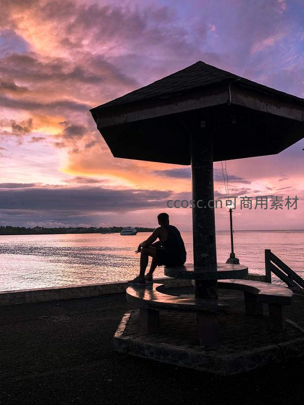 绚丽晚霞染红天际,一人静坐海边凉亭内,面朝波光粼粼的海面,远船点点,构成一幅诗意而安宁的黄昏风景画。