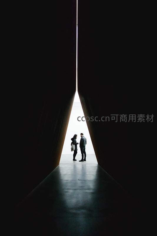 两人站在巨大建筑结构形成的狭长光缝中,逆光形成鲜明剪影,营造出神秘、浪漫且富有设计感的空间氛围。