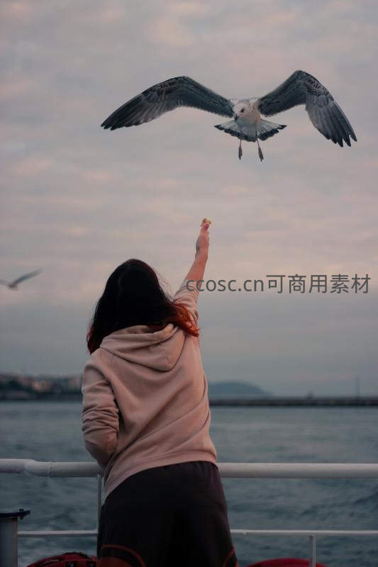 女子在船舷边伸手喂食展翅飞来的海鸥,背景是辽阔海面与暮色天空,捕捉人与自然亲密互动的动人一刻。