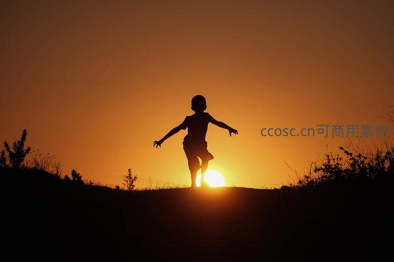 落日余晖将大地染成橙红色,一个孩子的剪影在山丘上欢快奔跑,双臂张开,仿佛拥抱整个黄昏,充满自由与纯真的生命力。