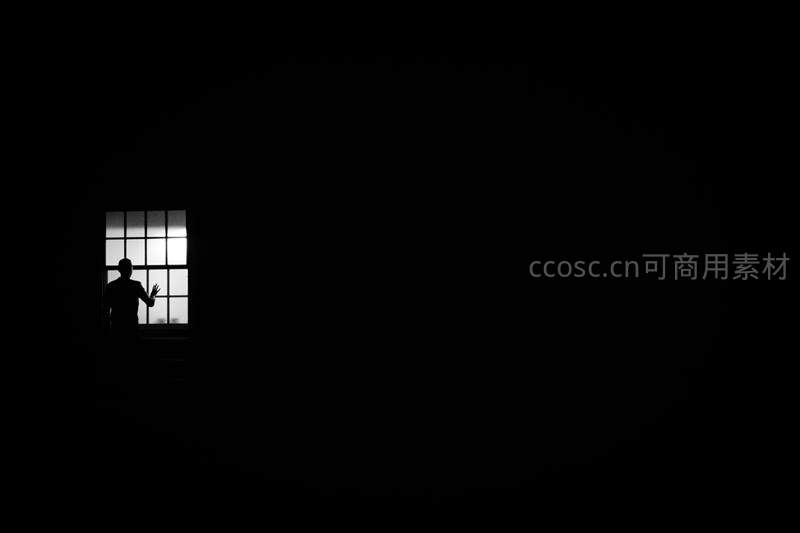 在一片漆黑的空间里,一扇透光的窗户成为唯一光源,窗前的人影举起手挥别,强烈的明暗对比营造出戏剧性的离别与思念情绪。