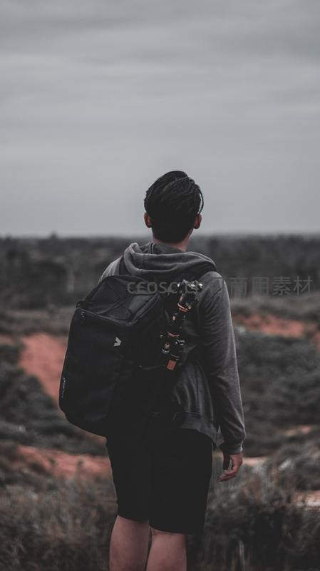 一位背着专业相机包的旅人,独自伫立在开阔的荒野中,凝视着远方的地平线,仿佛在思考下一段旅程的方向。