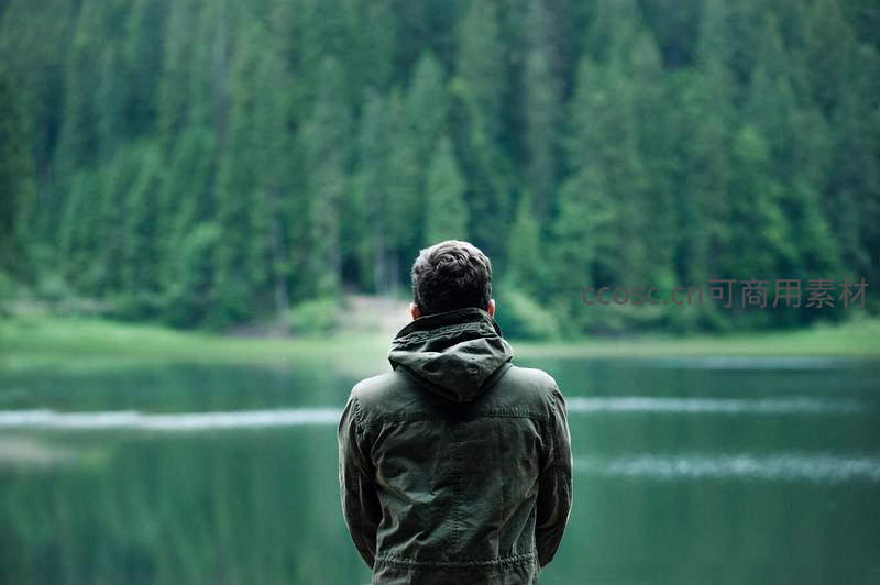 一个人静静地站在湖边,面对着一片郁郁葱葱的原始森林,湖水如镜,倒映着树木,营造出一种远离尘嚣的安宁氛围。
