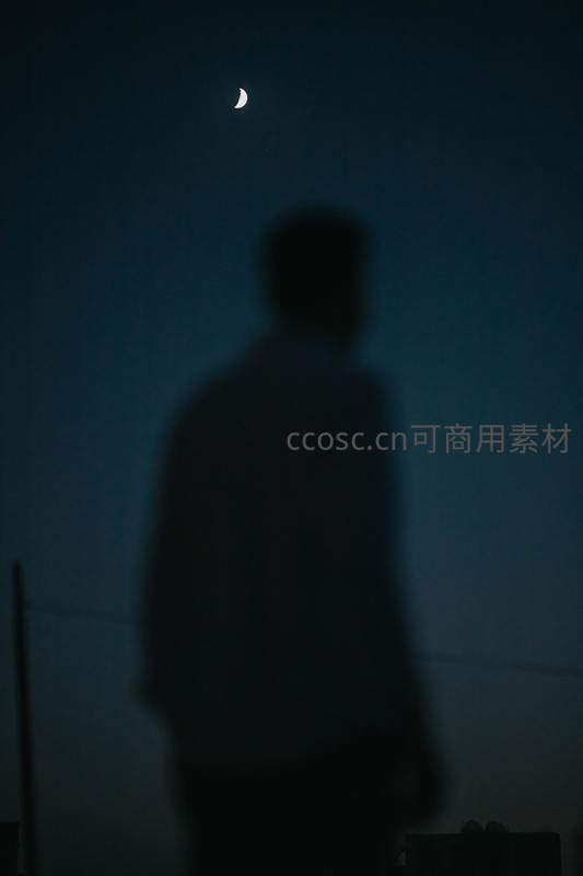 夜幕低垂,一弯新月高悬天际,一个模糊的人影静静伫立,仿佛在凝望宇宙的深邃,营造出一种静谧而略带忧郁的氛围。