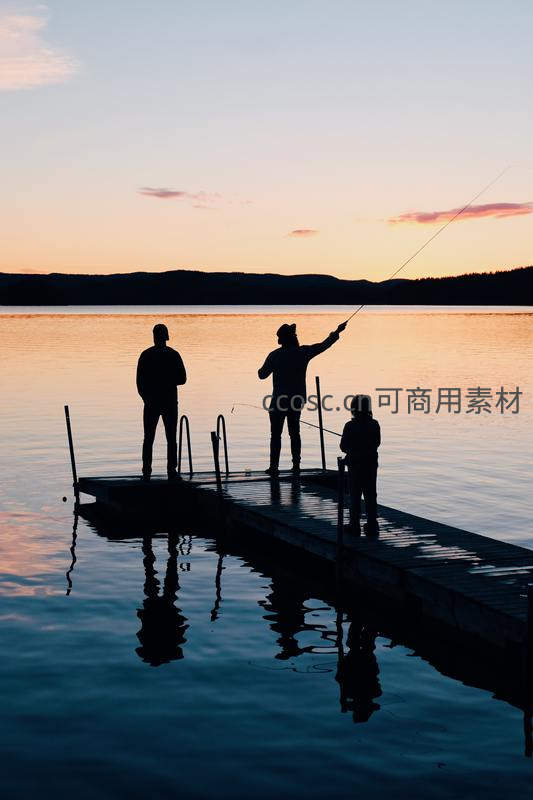 夕阳西下,金色的余晖洒满湖面,一家三口的剪影站在木质码头上悠闲垂钓,水面倒映着他们的身影,构成一幅温馨和谐的画面。