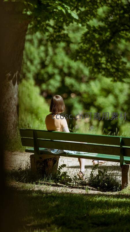 一位女子独自坐在公园绿树成荫下的长椅上,背对镜头,享受着午后的宁静与阳光透过树叶洒下的斑驳光影,氛围安逸而美好。