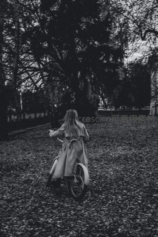 在铺满落叶的林间小道上,一位长发女孩骑着自行车渐行渐远,黑白影像强化了秋日的静谧与怀旧感,传递出一种自由自在的文艺气息。