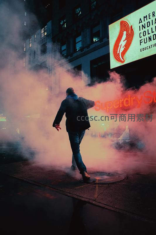 夜晚的城市街头,一名男子从弥漫的彩色烟雾中走过,身后是闪烁的广告牌与霓虹灯光,营造出迷幻动感的现代都市氛围。