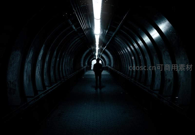 一个人站在深邃的金属隧道中央,头顶唯一的光源投下冷冽蓝光,两侧弧形结构延伸至远方,营造出神秘而压抑的空间感。