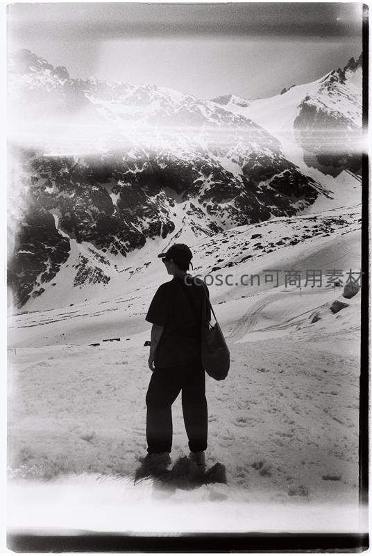 一位旅人独自伫立在白雪皑皑的高山之巅,远眺连绵的雪峰,画面充满孤寂与壮阔感,展现了人与自然的对话。
