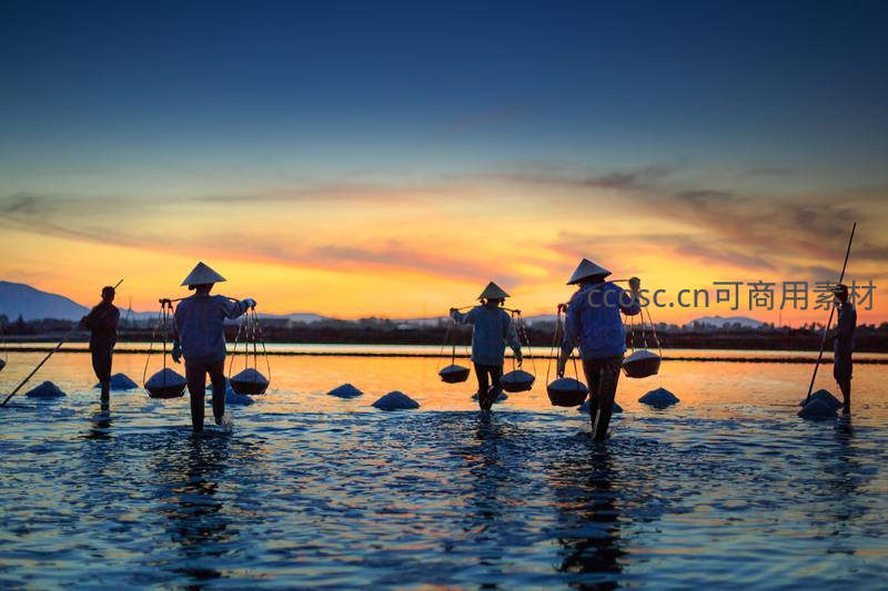 几位头戴斗笠的渔民在波光粼粼的盐田中劳作,夕阳将天空染成金红,他们的身影与水面倒影构成一幅诗意的田园画卷。