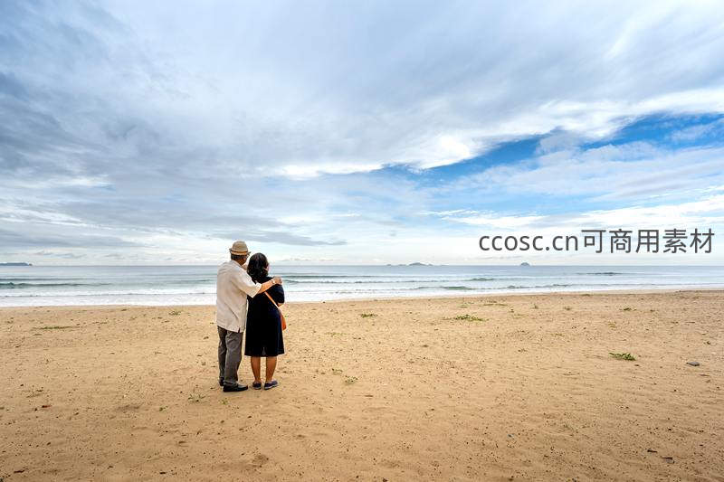 沙滩上老夫妻相拥远眺蔚蓝大海