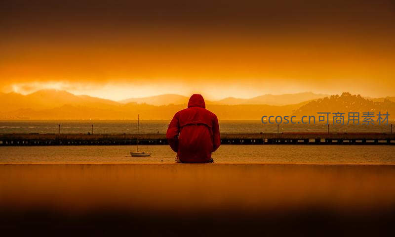 一位穿着红色连帽外套的人独自坐在码头边缘,背对镜头,凝视着被橙红色晚霞染透的海面与远山,画面充满沉思与宁静之美。