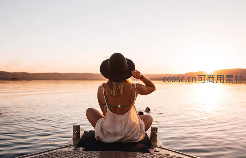 金发女子戴黑帽坐于船头,双手轻扶帽檐,静静欣赏湖面倒映的夕阳,水天一色,温柔光影营造出悠闲度假的惬意氛围。