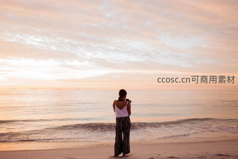 海边女子举相机,定格粉霞漫天的温柔时刻
