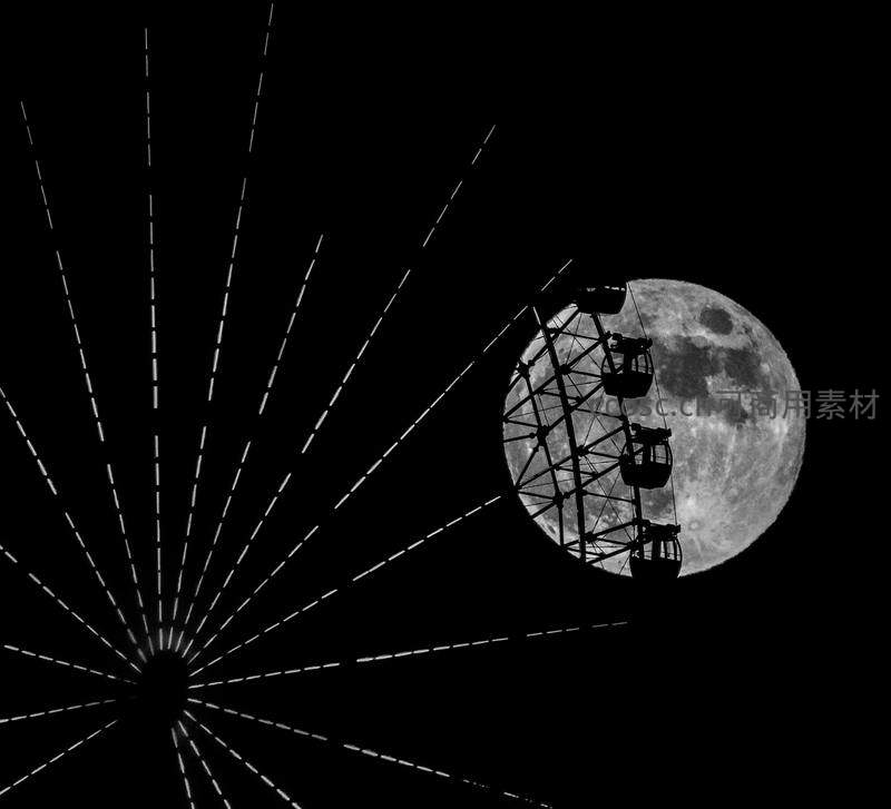 在纯黑背景下,摩天轮的金属骨架剪影巧妙地框住一轮满月,形成强烈的视觉冲击力。
