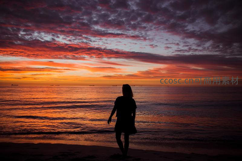 一名女子沿着海岸缓步前行,她的轮廓被绚烂的落日染成黑色剪影,脚下是轻拍岸边的波浪,头顶是燃烧般的云层,整幅画面洋溢着温暖与自由的气息。