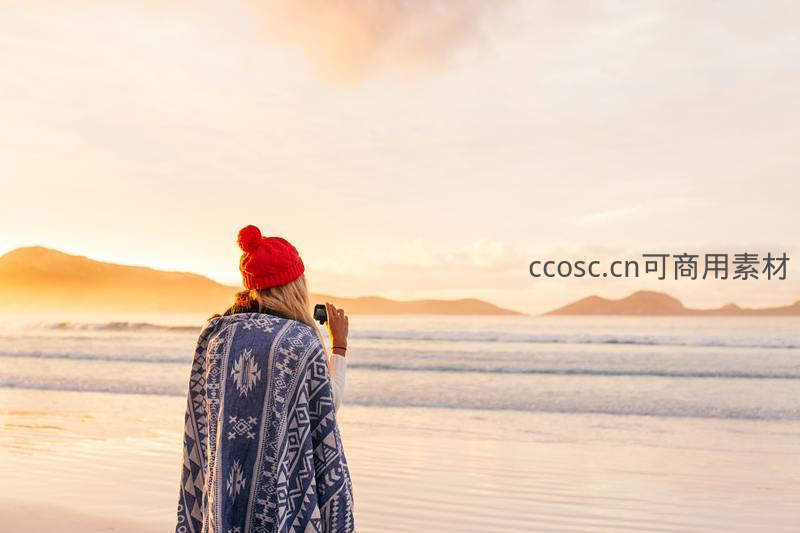一位戴着红色毛线帽、披着民族风披肩的少女站在海边,正用手机记录眼前金色的日落美景,远处山峦朦胧,海浪轻柔,画面温馨而富有生活气息。
