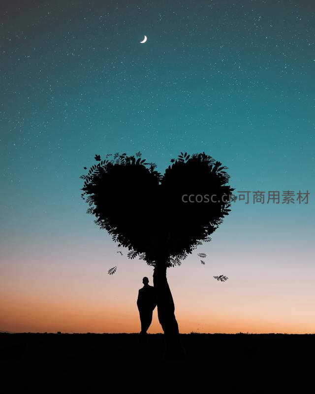 一对情侣依偎在心形树冠下,背景是渐变暮色与繁星点点的新月夜空,飘落的树叶增添温柔氛围,象征爱意与宇宙的静谧共鸣。