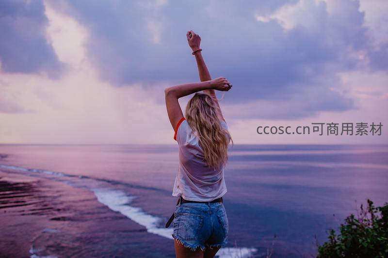 金发少女在紫色晚霞映照的海岸边,高举手臂,迎着海风伸展身体,享受着旅途中的惬意与无拘无束的快乐时光。