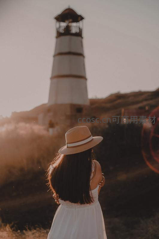 戴着草帽的女子背对镜头,静静凝视着远方沐浴在金色夕照中的古老灯塔,暖色调光影营造出浪漫而略带怀旧的氛围。