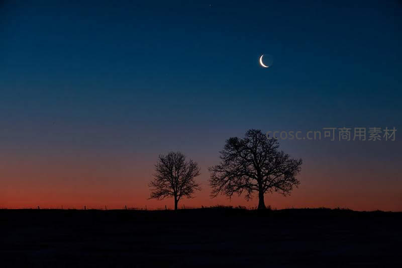深蓝与橙红交织的天幕下,两棵枯树的剪影静立于地平线,一弯新月高悬,营造出诗意而寂寥的黄昏景象。
