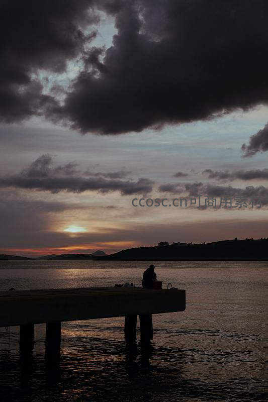 一人独自坐在延伸入水的码头上垂钓,头顶乌云密布却透出夕阳光芒,远处山峦与水面倒影相映,营造静谧孤独的黄昏意境。