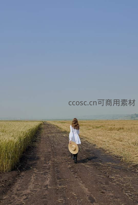 一位穿白衣的女子背对镜头走在收割后的麦田间土路上,手持草帽,蓝天无垠,画面充满田园诗意。