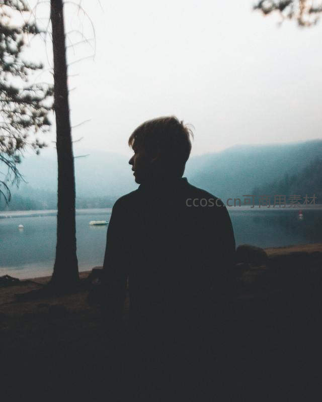 一人静立湖边,背对镜头凝望远方薄雾笼罩的群山,湖面平静如镜,营造出深邃而宁静的氛围。