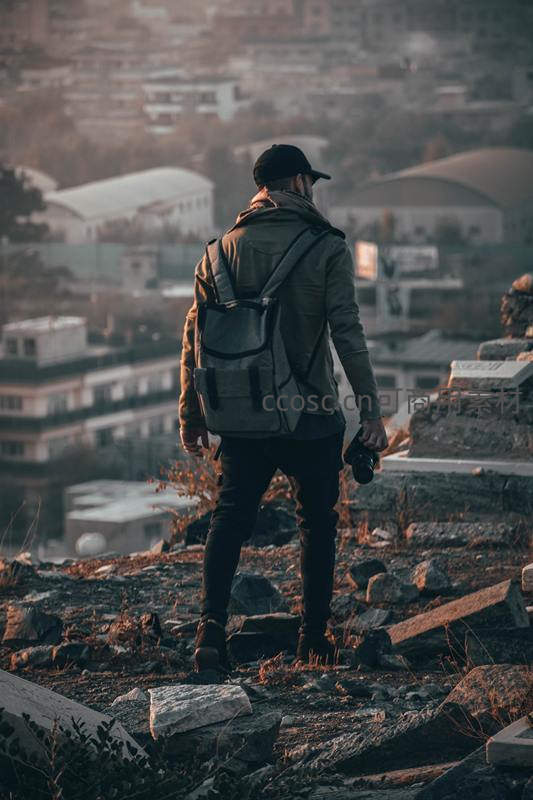 一名背着相机包的摄影师站在城市边缘的碎石坡上,手持相机,凝视着远方被暮色笼罩的城市建筑群,展现出探索与创作的专注姿态。