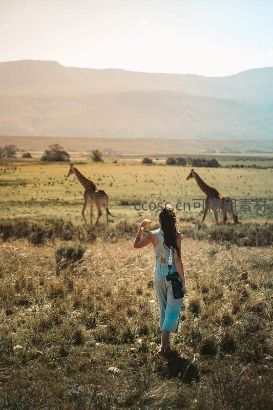 游客在辽阔草原上驻足,手持相机记录身旁漫步的长颈鹿,远处山峦朦胧,阳光洒满大地,人与自然和谐共生的画面。