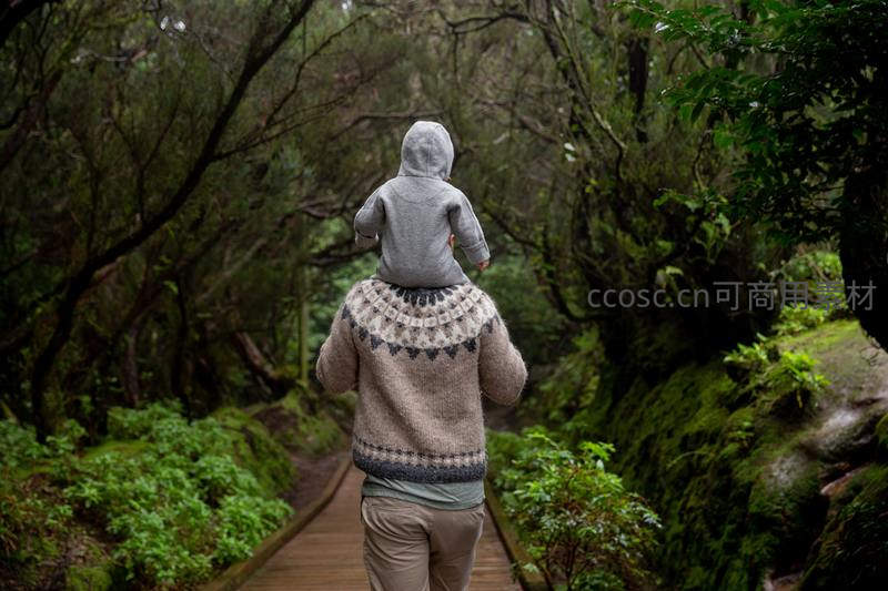 一位父亲背着孩子行走在郁郁葱葱的林间木栈道上,四周绿意盎然,画面充满亲情的温暖与自然的静谧。