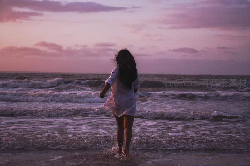 一位长发少女赤脚奔跑在沙滩上,身后是层层叠叠的浪花与梦幻般的粉紫色晚霞,画面宁静又充满动感,洋溢着青春与自由的气息。