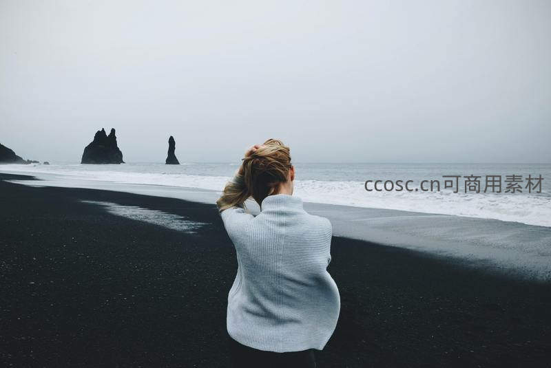 一位女子背对镜头站在黑色火山砂海滩上,凝视远处矗立的海蚀柱,灰白天空与深色海岸形成强烈对比,传递出神秘、静谧的异域风情。