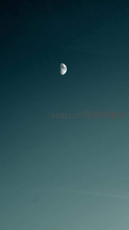 纯净的青蓝色天空中,一弯半圆的月亮独自高悬,画面简洁空灵,传递出一种宁静、孤独而又清新的视觉感受。