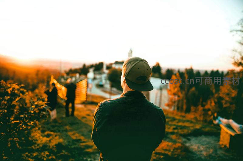 一名戴帽男子在夕阳余晖中静静站立,俯瞰山脚下的小镇,金色光线洒满大地,营造出温暖而略带怀旧的旅行氛围。