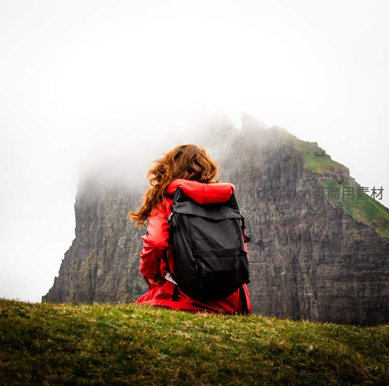 一位身着鲜红冲锋衣、背着黑色背包的旅行者坐在草坡上,凝视前方云雾缭绕的陡峭山崖,画面充满冒险精神与自然敬畏感。