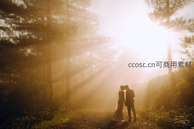 一对新人在晨雾弥漫的森林小径上相拥,金色阳光穿透树梢洒下光束,营造出梦幻而温馨的婚礼氛围。