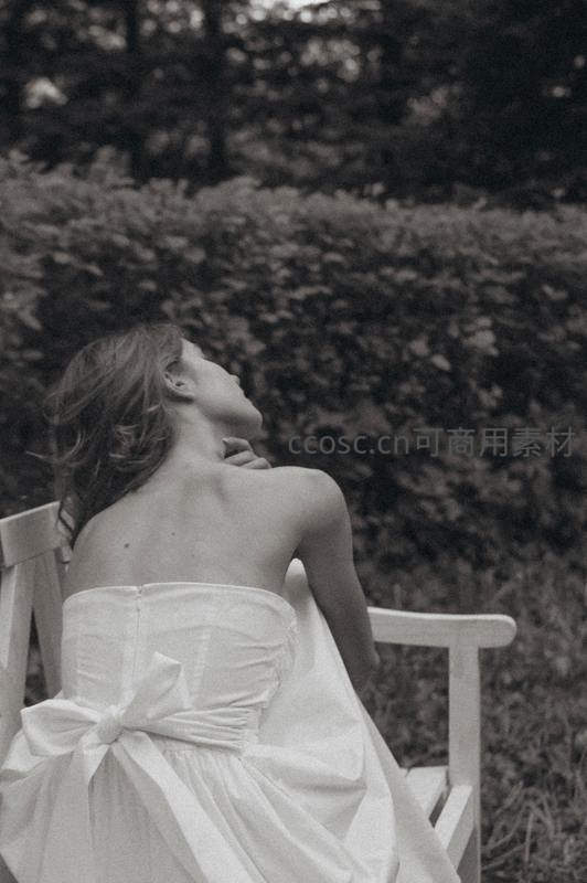 一位身穿白色抹胸婚纱的新娘坐在户外长椅上,仰头闭目,享受宁静时光,背景是模糊的绿植,充满诗意与浪漫。
