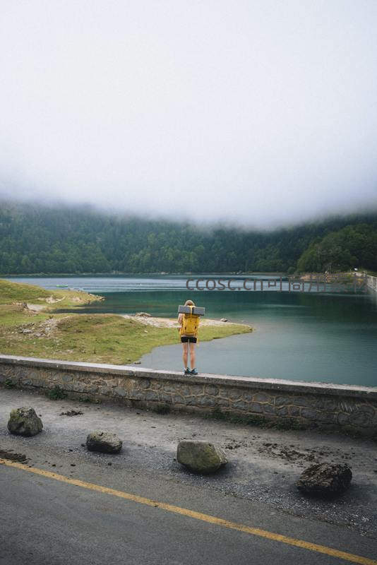 一名背着背包的旅行者站在湖边石墙旁,远眺被薄雾笼罩的青山绿水,画面宁静而富有探索感,令人向往远方。
