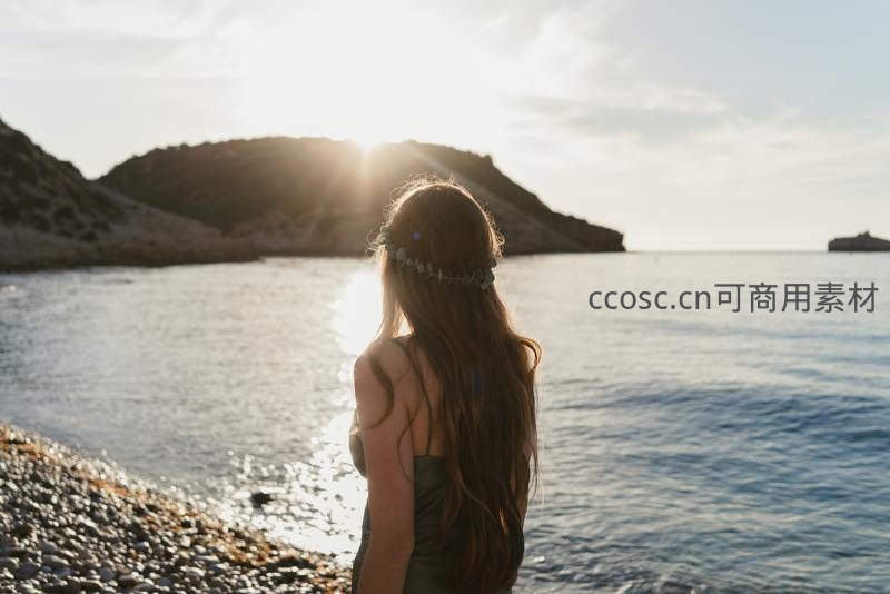 一位戴着花环的少女背对镜头,站在布满鹅卵石的海岸边,金色阳光洒在海面上,营造出温暖而梦幻的黄昏氛围。