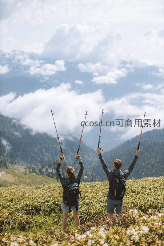 两位徒步者在高山草甸上高举登山杖,身后是连绵的森林山脉与翻滚的云海,享受征服自然的喜悦与开阔视野。