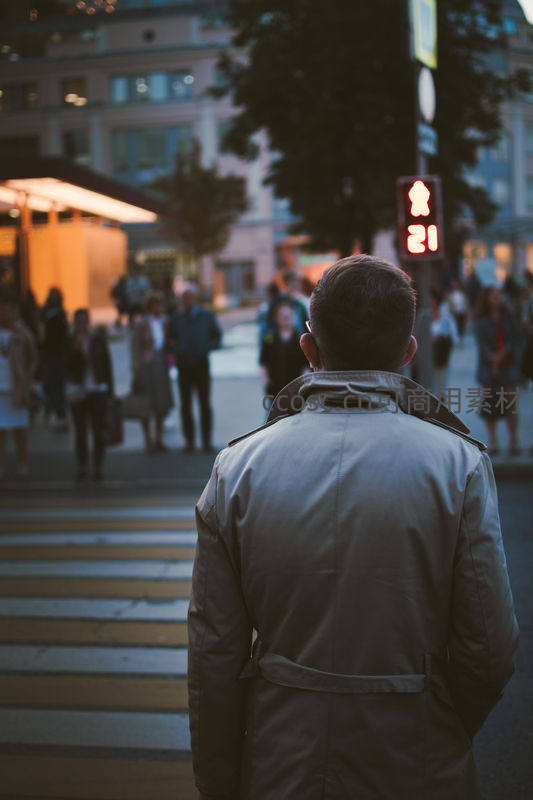 黄昏街角,男子伫立斑马线前等待过街