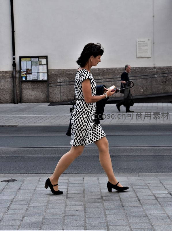 一位穿着黑白菱格连衣裙的女士正迈步穿过街道,手持手机,神情专注,简约背景衬托出她的干练与优雅,展现都市女性日常风采。