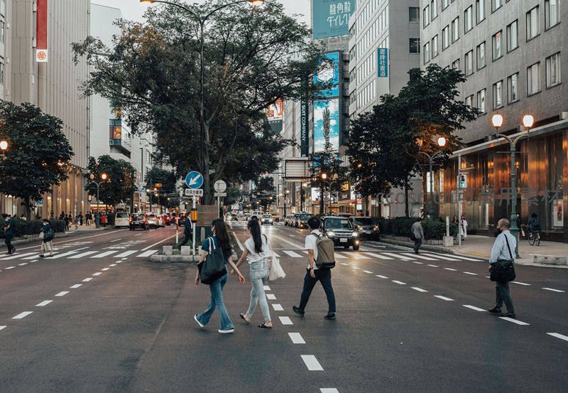 暮色渐浓,几位行人正在横穿车水马龙的商业大道,两旁高楼林立、广告牌闪烁,路边绿树成荫,呈现出都市傍晚的活力与秩序。