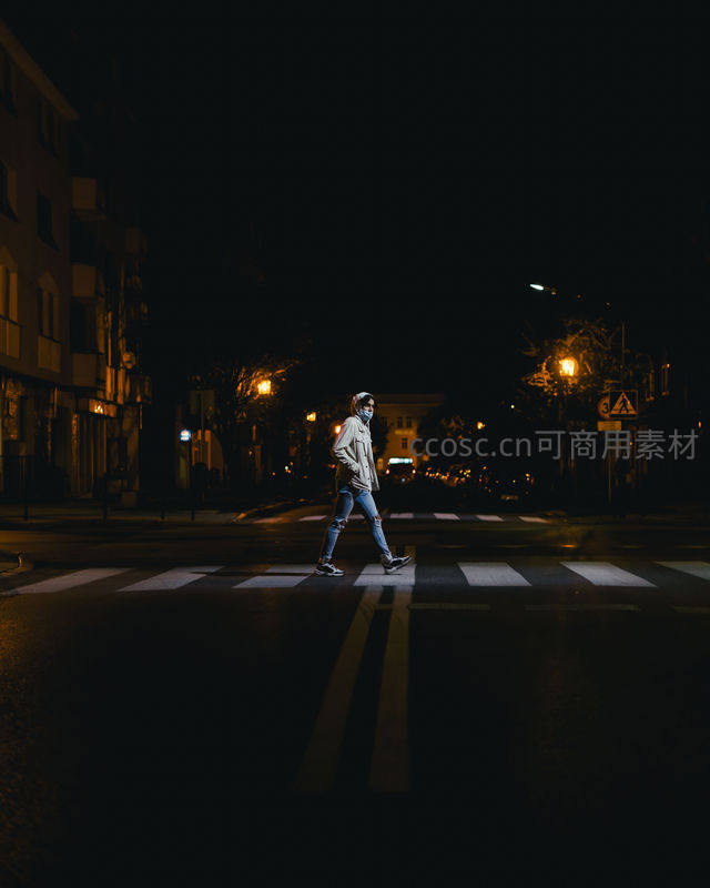 在寂静的深夜,一名戴口罩的行人独自走过被路灯照亮的斑马线,四周建筑隐入黑暗,凸显都市夜晚的孤独与宁静。