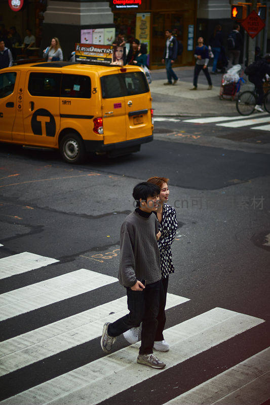 一对年轻情侣在城市街头的斑马线上相视而笑,背景是穿梭的黄色出租车和熙攘行人,充满都市生活的温馨与活力。