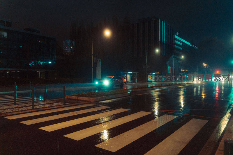 雨夜城市街角,车灯倒影映湿漉斑马线