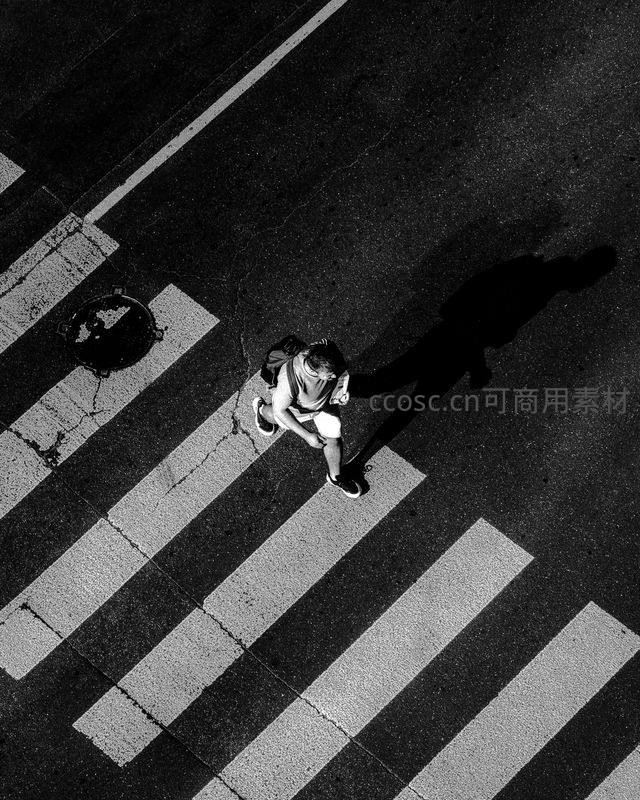 从高空俯拍一名行人独自穿过斑马线,强烈的光影对比与拉长的身影营造出视觉张力,传递出现代都市中个体的疏离感。
