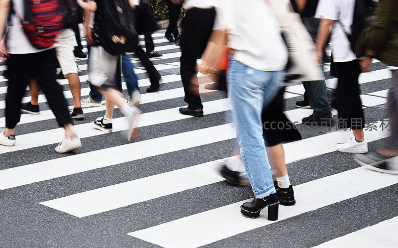 镜头捕捉了大量行人快速通过斑马线的瞬间,动态模糊效果突显了城市的繁忙与活力,是现代都市生活节奏的真实写照。